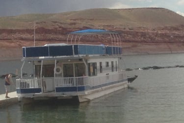 This is a Party Top we built and installed on a Boatel Houseboat docked at Cottonwood Cove, Arizona. The before and after pictures show the improved comfort and usage of his top deck.